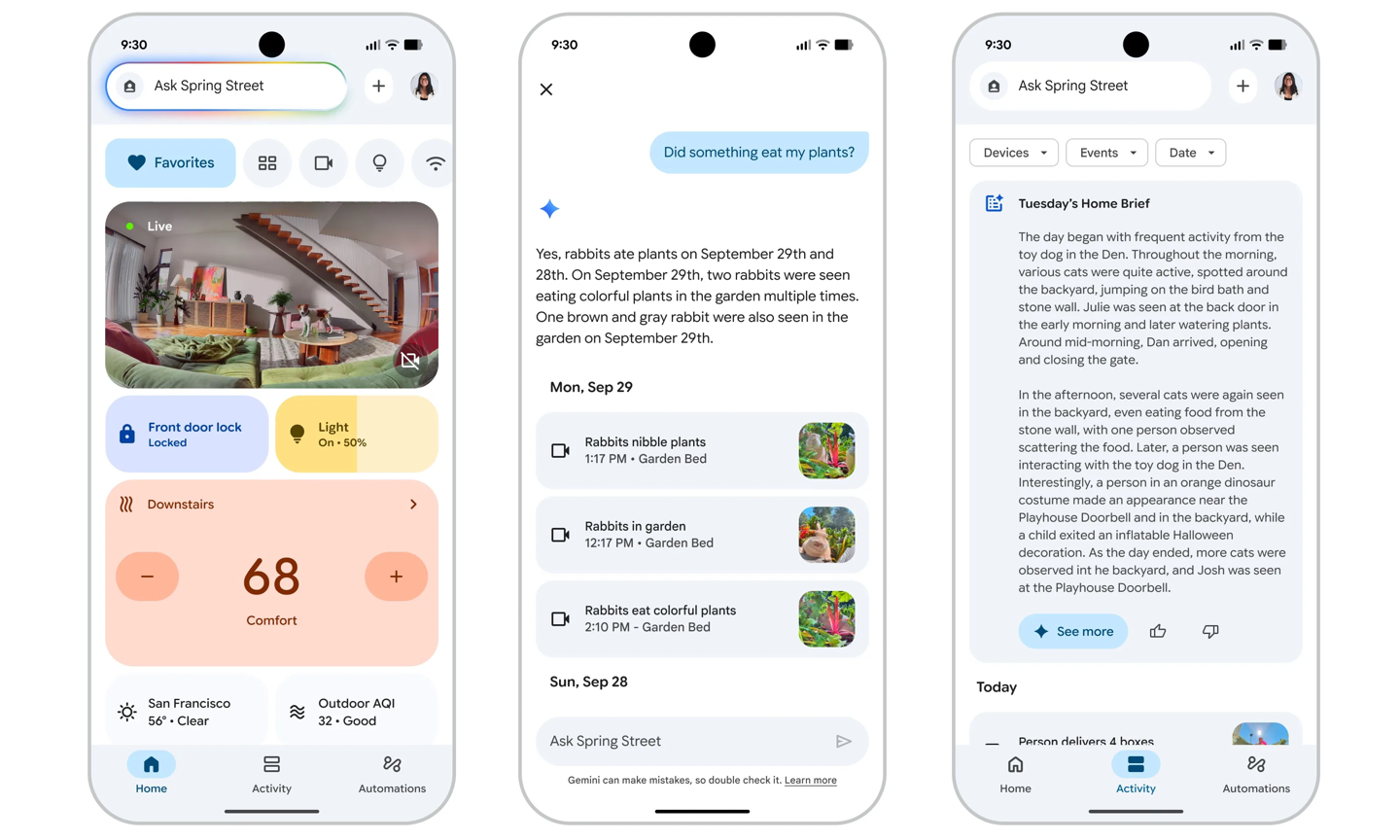 摄像头通知功能得到升级,内容更详细。若不想被频繁打扰,可启用 Home Brief 功能,让系统汇总几小时内的事件。用户还可直接询问“花瓶怎么碎的?”,Gemini 会自动调出相关录像。